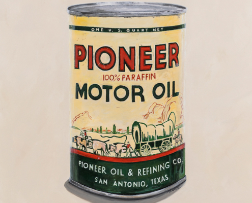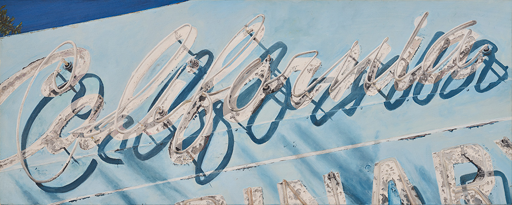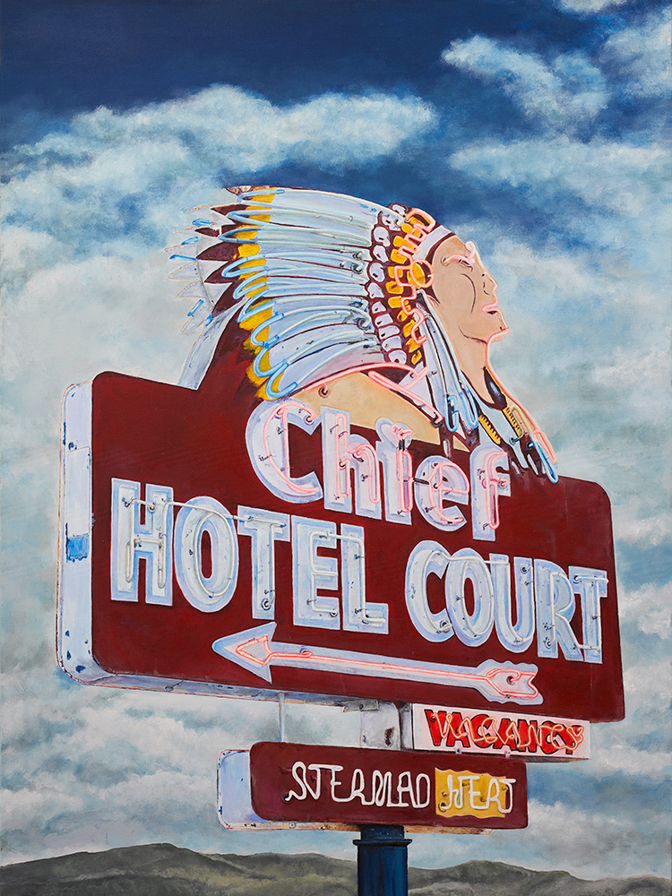The exhibition includes a series of Cowboy and Indian images presented as iconic signifiers o the West. These neon signs and studies of vintage motor oil cans are portrayed with the same reverence for the past and attention to detail that we have come to expect from this uniquely talented, self-taught painter.