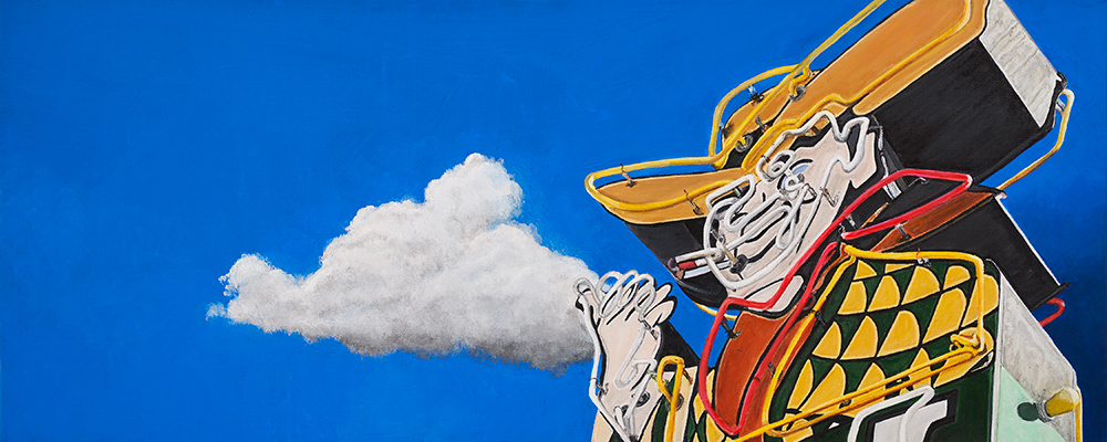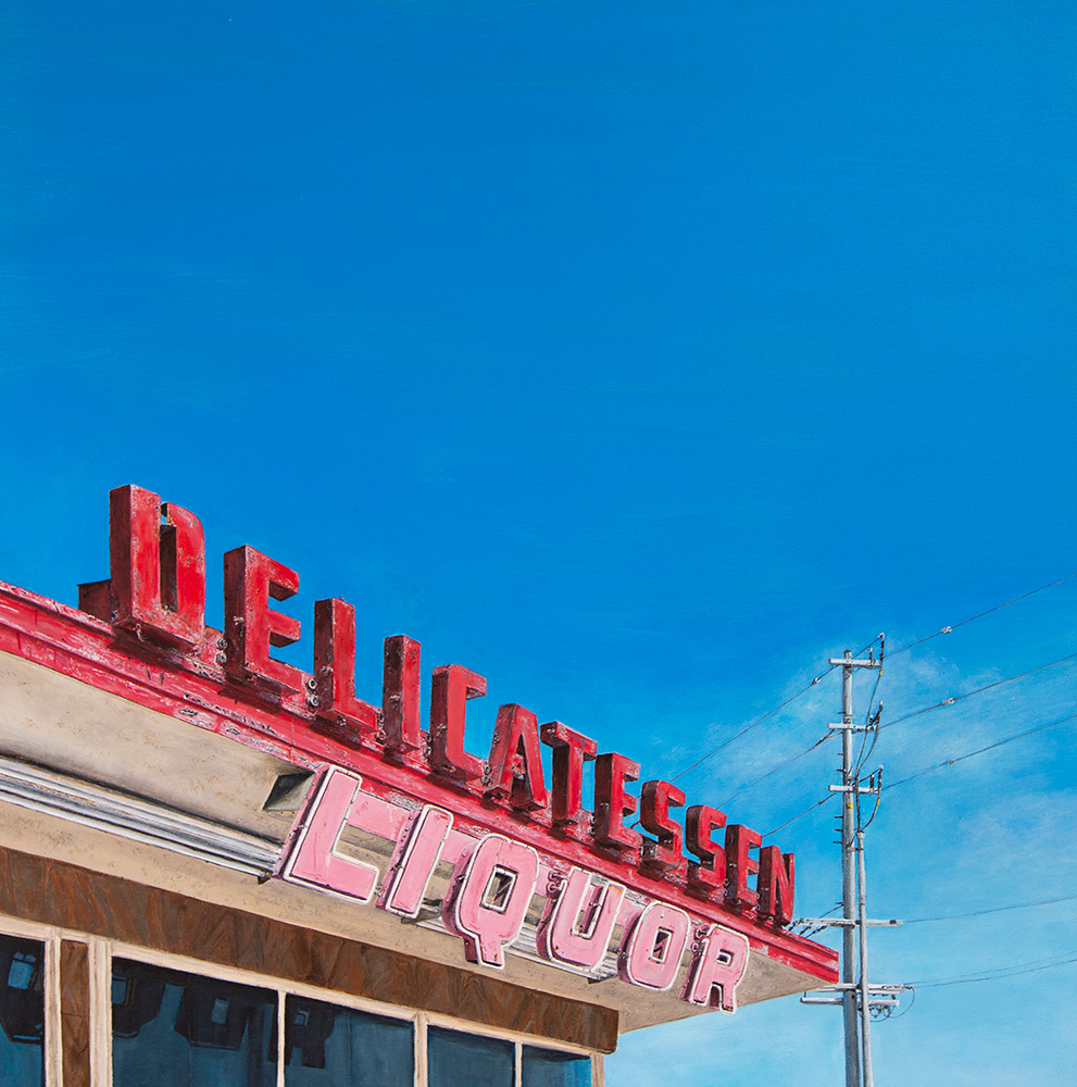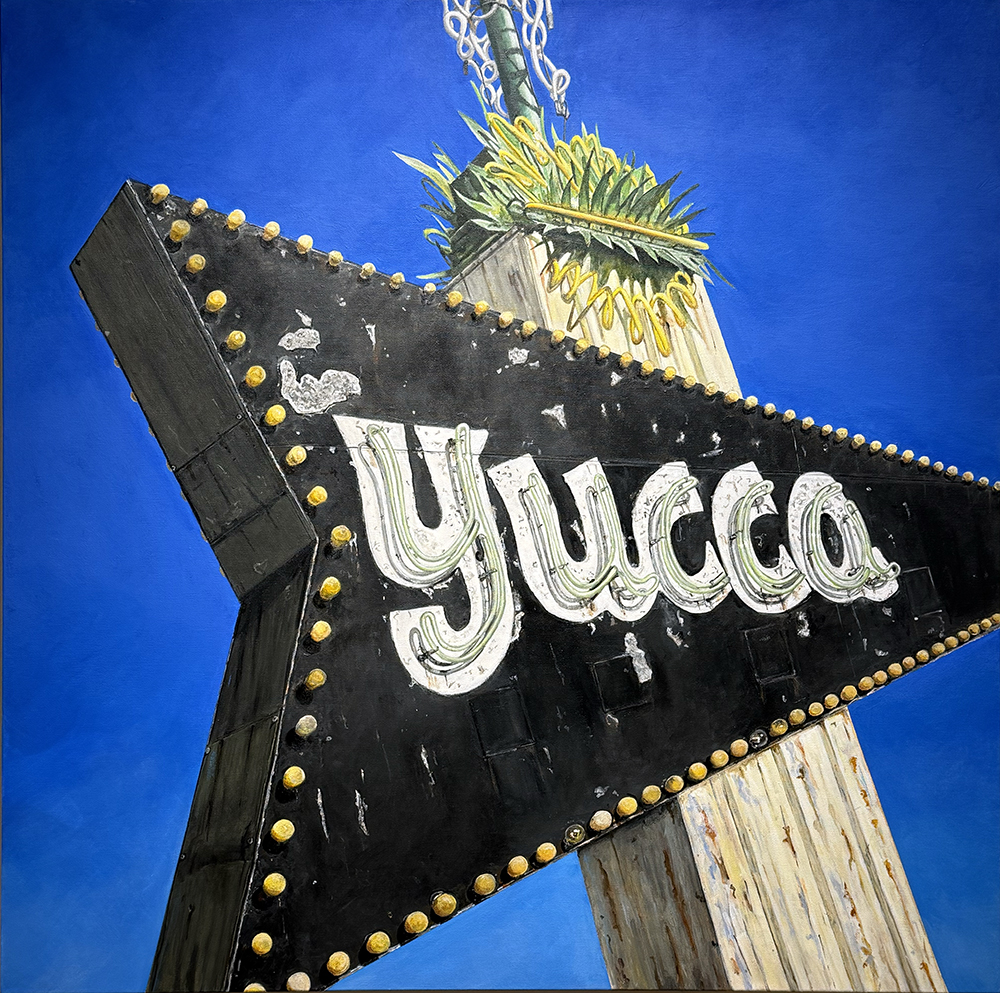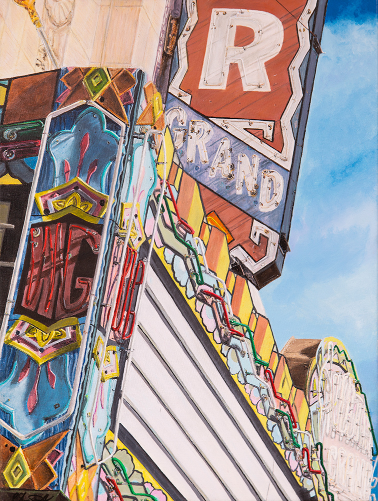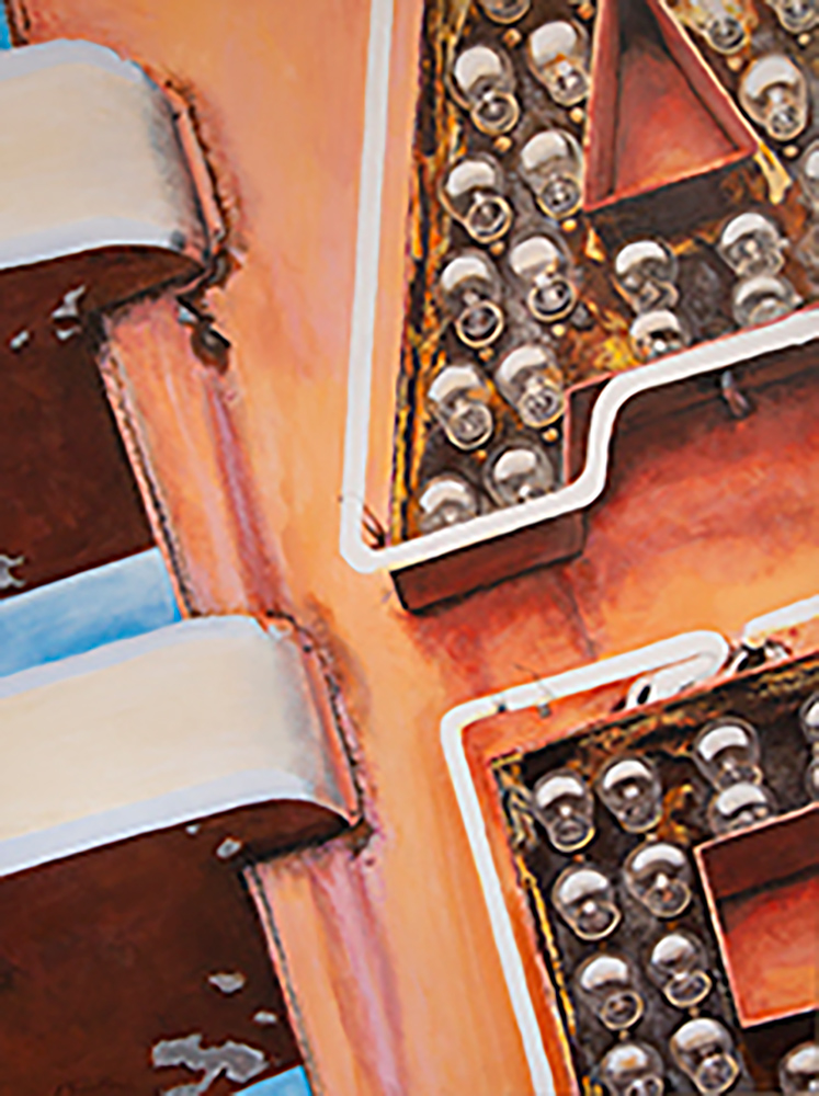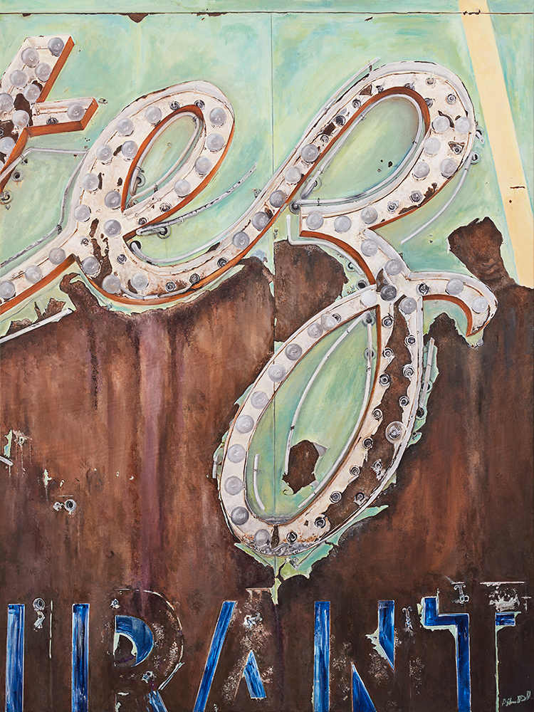 With a background in photojournalism and editorial photography, the artist brings a mastery of storytelling, along with a keen eye for composition, to his paintings. Images extend beyond the edges of the canvas, the vantage point looking up from below, making the larger-than-life signs the heroes in their own story.