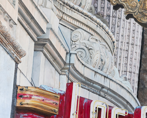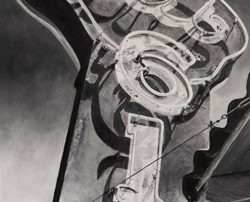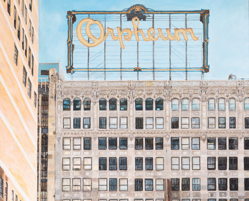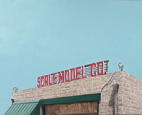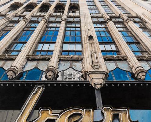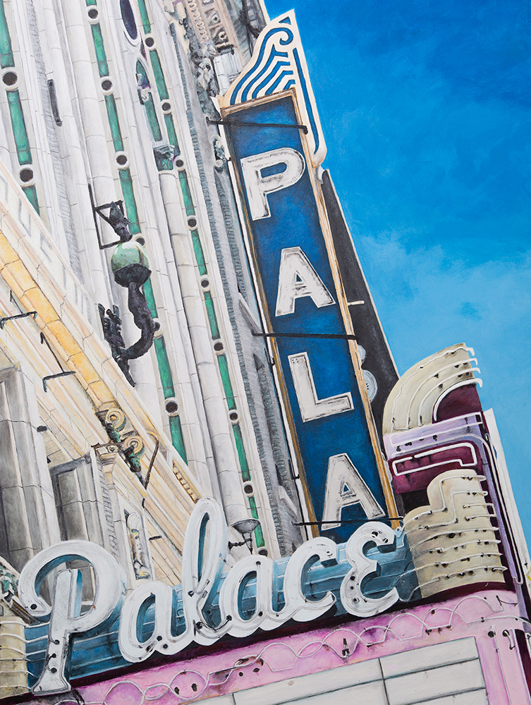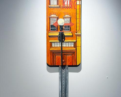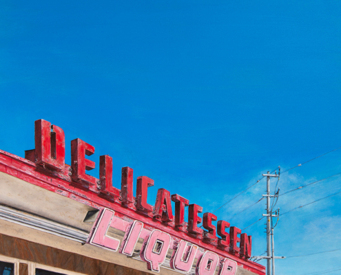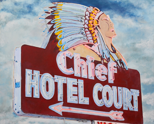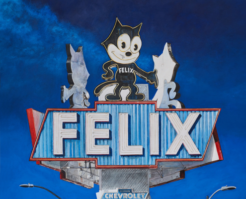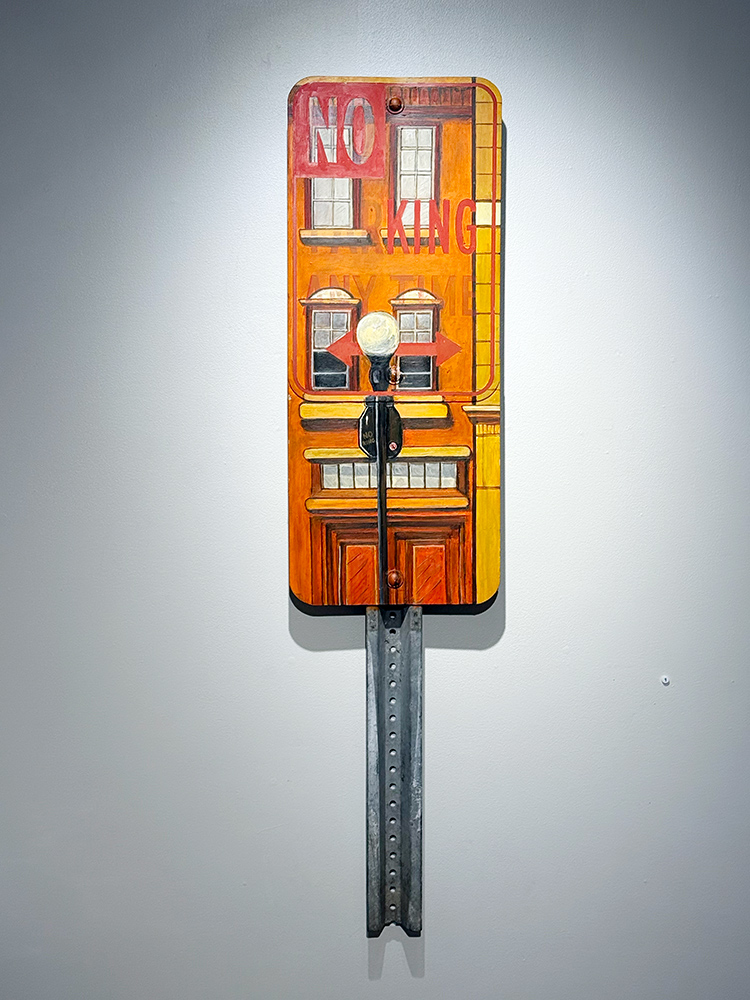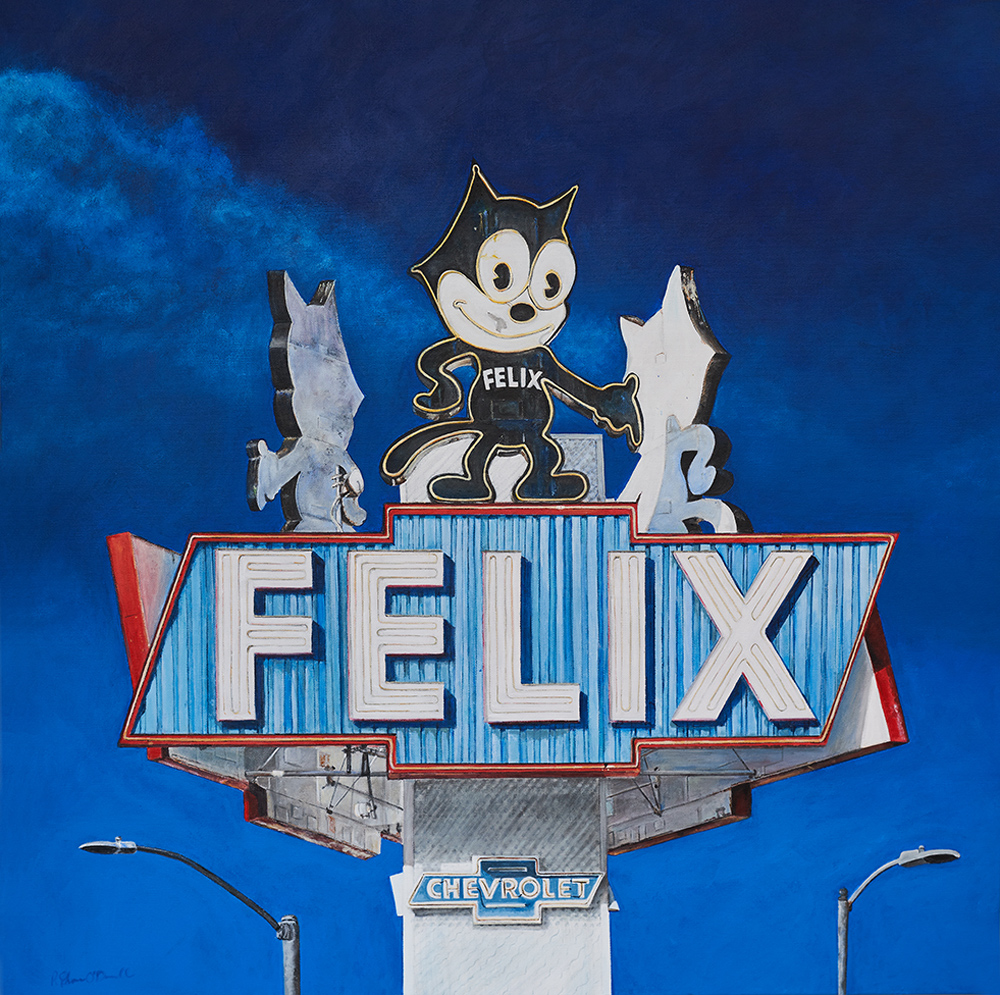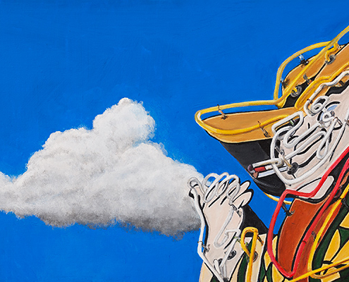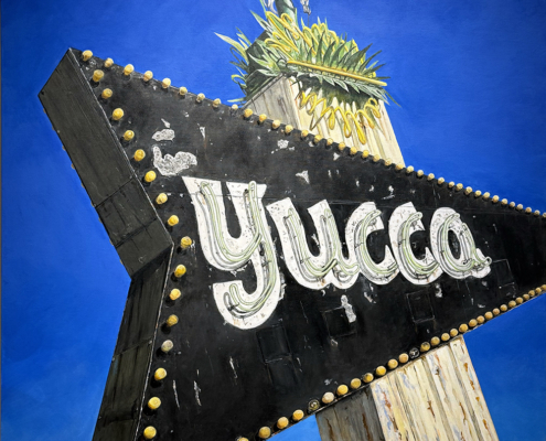 With a background in photojournalism and editorial photography, the artist brings a mastery of storytelling, along with a keen eye for composition, to his paintings. Images extend beyond the edges of the canvas, the vantage point looking up from below, making the larger-than-life signs the heroes in their own story.