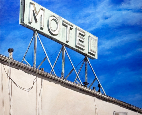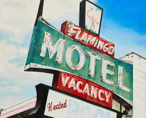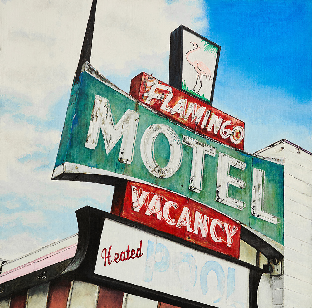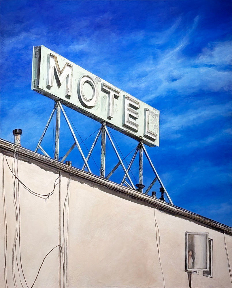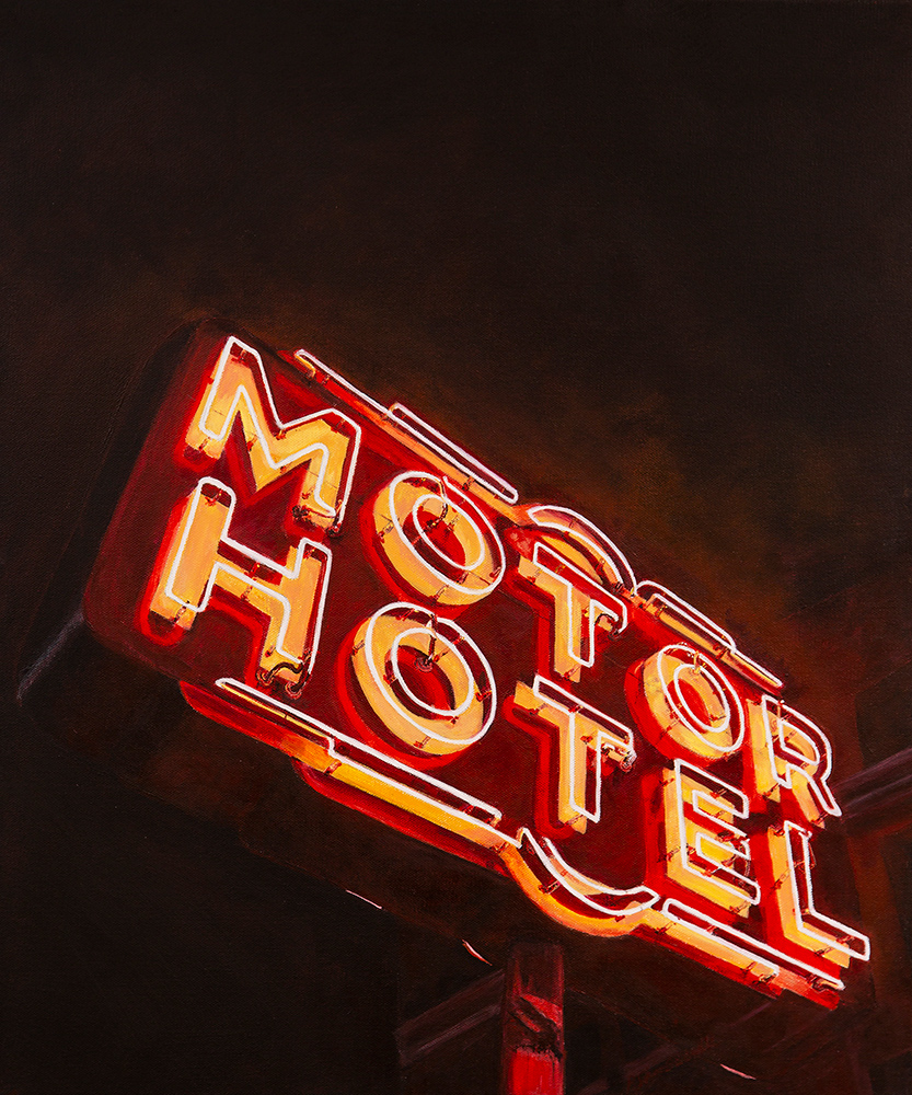 A South Bay photographer turned painter, Shane O’Donnell brings his passion for Americana to Neon + Rust, a showcase of his recent canvases exploring vintage neon signs and their aging patina. What began as a personal challenge to elevate with paint what he captured with his camera, O’Donnell has committed to documenting historic neon signage, along with the building facades that support them, in a distinctive photorealism-inspired style. The result is a body of work that portrays their decaying beauty with remarkable precision and a fresh perspective that merits a closer look.